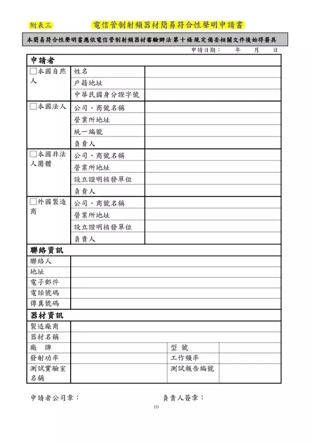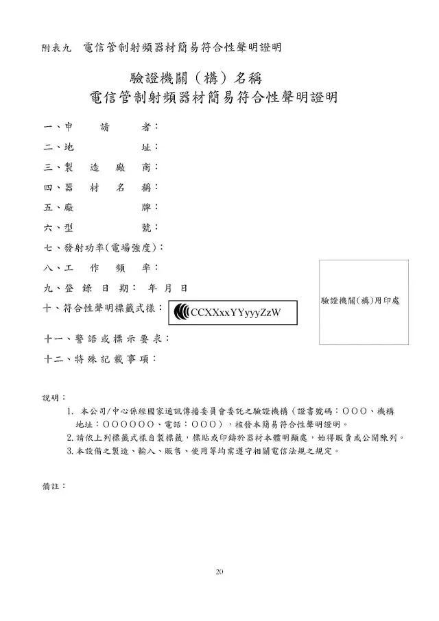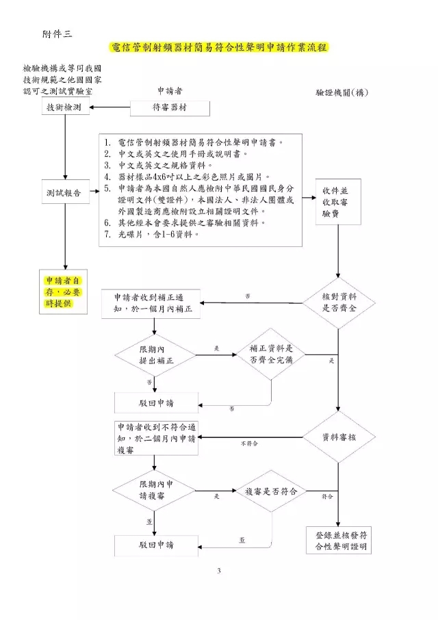 簡易符合性聲明證明是審驗(yàn)證明方式之一(還有型式認(rèn)證證明,符合性聲明證明),是由臺(tái)灣公司或者非臺(tái)制造商聲明其電信管制射頻器材符合臺(tái)灣通訊傳播委員會(huì)所制定的技術(shù)規(guī)范,并檢附相關(guān)文件向驗(yàn)證機(jī)構(gòu)辦理登錄,經(jīng)登錄完成后,由驗(yàn)證機(jī)構(gòu)核發(fā)審驗(yàn)證明,必要時(shí)驗(yàn)證機(jī)構(gòu)要求申請(qǐng)者提供測(cè)試報(bào)告(臺(tái)灣認(rèn)可測(cè)試機(jī)構(gòu)或等同臺(tái)灣技術(shù)規(guī)范的其他國家認(rèn)可的測(cè)試機(jī)構(gòu)簽發(fā)的報(bào)告)。