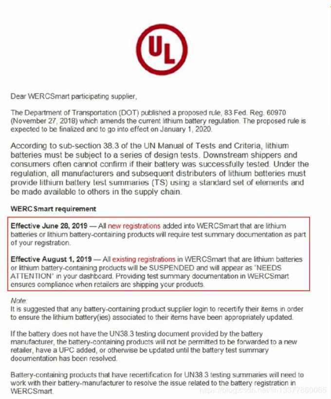 基于該規(guī)則的要求,鋰電池的必須根據(jù)UN38.3的標準進行測試,而通常含鋰電池產(chǎn)品的運輸方或者消費者并不能夠確認電池是否經(jīng)過完整的測試并通過。因此現(xiàn)在UL要求所有注冊WERCSmart的鋰電池或含鋰電池產(chǎn)品都需要上傳UN38.3的測試報告。