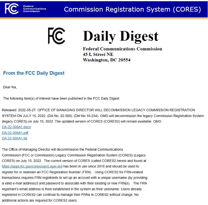 近期FCC發布官方信息,將于2022年7月15號關閉舊的FRN注冊系統the legacy Commission Registration System(簡稱CORES),開始使用新版本的系統CORES2。新舊系統的差異主要在于新CORES2申請的FRN用戶要求繳納年費。1. 從現在開始,申請新的FRN只能在CORES2系統上操作,訪問新系統前用戶需先注冊一個賬號,以郵箱地址作為賬號名注冊;